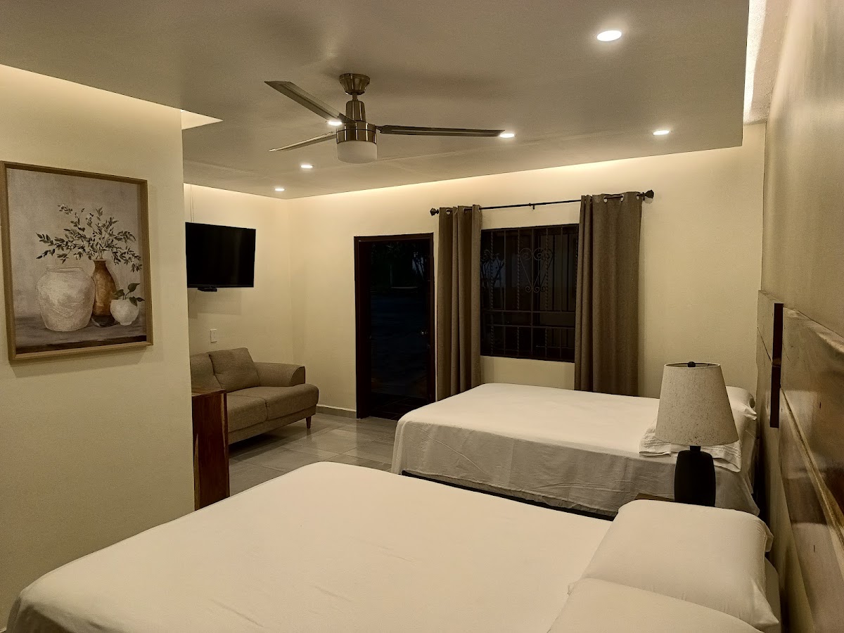El lugar muy lindo y limpio. Sus habitaciones son amplias cómodas amuebladas, algunas habitaciones cuentan con frigobar. No cuentan con alberca, está a 20 min de la playa. Por una habitación triple dos matrimoniales y 1 individual se pagó 1200. Llegando en día sábado en temporada baja